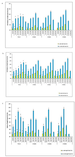 Mean ratios of HMR EOP plotted at 2-week intervals, selected on plates with two concentrations of HM. (a) Mean ratios of CdR EOP. (b) Mean ratios of Zn resistant EOP. (c) Mean ratios of Hg resistant EOP. * p < 0.05 compared to the HMR/total bacterial CFU ratios in HM-spiked microcosms; † p < 0.05 compared to the HMR/total bacterial CFU ratios in the same HM-spiked microcosms at the 6-week interval.