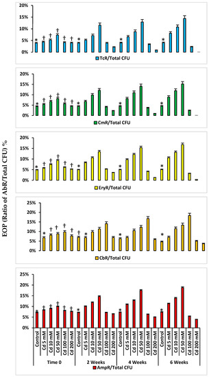 Mean AbR EOPs selected on Abs for Cd-spiked microcosms. * p < 0.05 compared to the AbR EOPs in Cd-spiked microcosms; † p < 0.05 compared to the AbR EOPs in the same Cd-spiked microcosms at 6 weeks.