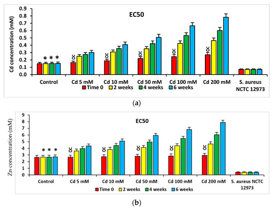 PICT analysis of microbial EC50s for Cd, Zn and Hg from Cd-spiked microcosms showed there were larger Cd EC50 values for bacterial consortia from Cd-spiked microcosms compared to those from control microcosms (p < 0.05). Lower EC50 values for Cd were determined for bacterial consortia from Cd-spiked microcosms at time zero compared to those for consortia from the same microcosms at the 2-, 4- and 6-week sampling points (Figure 3). Similar trends were observed for EC50 values of Cd, Zn and Hg for bacterial communities from Zn- and Hg-spiked microcosms (Supplementary Figures S3 and S4).