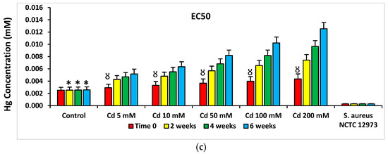 Mean EC50 values of PICT analysis with (a) Cd, (b) Zn and (c) Hg for bacteria from Cd-spiked microcosms. * p < 0.05 compared to Cd, Zn or Hg EC50 values for bacteria from Cd-spiked microcosms at the same time point; Ȣ p < 0.05 compared to Cd, Zn or Hg EC50 values for bacteria from Cd-spiked microcosms at 2, 4 and 6 weeks. Staphylococcus aureus NCTC 12973 was a negative control.