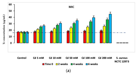 PICT analysis of minimum inhibitory concentrations (MIC) for Tc, Cm, Ery, Cb and Amp for microbial consortia isolated from Cd-spiked microcosms showed there were higher MIC values for Abs from bacterial consortia from Cd-spiked microcosms compared to those from the control microcosms (Figure 4). Figure 4 shows MIC values for Tc for microbial consortia from HM-spiked microcosms and the results for other Abs are shown in the supplementary data (Supplementary Figures S5–S16). Similar trends were determined for MIC values of Ap, Cm, Ery and Cb and for bacterial consortia from Zn- and Hg-spiked microcosms (Supplementary Figures S5–S16). The MIC values determined for microbial consortia (according to EUCAST ECOFF recommendations [10]) from microcosm soil were higher than the 20 µg mL−1 threshold defined for Ab resistance in soil bacteria for all of the five Abs at the 2-, 4- and 6-week time points [11,12], while these were lower than this threshold for Tc and Cm at time zero.