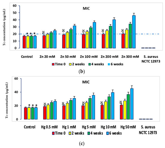Mean MIC values of PICT analysis with Tc for bacteria from HM-spiked microcosms (a) Cd-spiked, (b) Zn-spiked and (c) Hg-spiked. * p < 0.05 compared to Tc MIC for bacteria from Cd-spiked microcosms at the same time point; Ȣ p < 0.05 compared to Tc MIC and EC50 values for bacteria from Cd-spiked microcosms at 2, 4 and 6 weeks. The dashed line defines the AbR threshold for soil bacteria. Ab-sensitive S. aureus NCTC 12973 was a negative control.