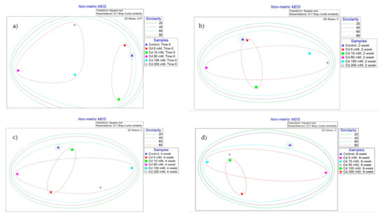 NMDS analysis plot of TRFLP relative peak height for Cd-spiked microcosms bacterial communities’ data, using the Bray–Curtis similarity indices. (a) Time zero, (b) 2-week incubation at 25 C (c) 4-week incubation at 25 C (d) 6-week incubation at 25 C. Significant difference (p < 0.05) between the clusters specified with >60% of similarity compared to the control microcosms.