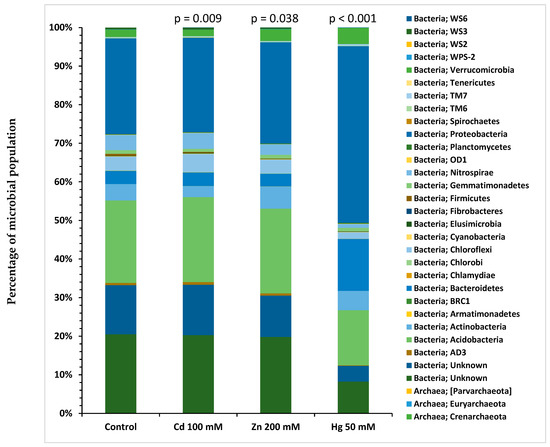 Assignment of 16S rRNA gene sequences to microbial phyla for selected HM-spiked microcosms (Cd 100 mM, Zn 200 mM and Hg 50 mM, control) soil samples after 6 weeks of incubation. p-values represent differences between data from HM and control samples.