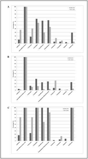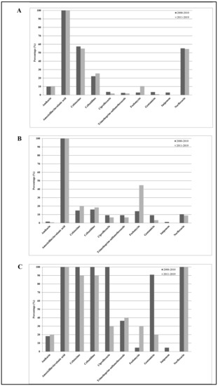 Distribution of mean antibiotic resistance percentages of Enterobacter cloacae isolates against the 10 antimicrobial agents tested, amikacin, amoxicillin/clavulanic acid, cefotaxime, ceftazidime, ciprofloxacin, norfloxacin, fosfomycin, gentamicin, imipenem, and trimethoprim-sulfamethoxazole, among all subjects enrolled in the study (A), among outpatients (B), and among hospitalized subjects (C) during the study periods 2000–2010 and 2011–2019.