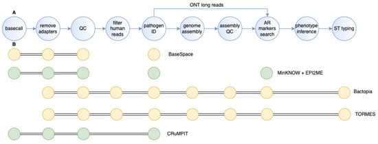 Pipelines for sequencing data analysis for clinical application. (A) Analysis steps need to be performed for pathogen identification and resistance markers search in clinical samples. (B) Existing pipelines and steps they include. Yellow—Illumina data only; green—ONT data only. Connected dots represent steps that are automatically performed in the workflow, whereas isolated dots represent independent analysis steps that need to be called by the user. The figure was created using draw.io.