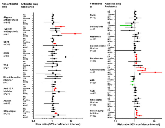 Risk of antimicrobial resistance and non-antimicrobial drug exposure. The forest plot shows the risk of infection with a drug-resistant organism expressing each of 5 resistance phenotypes, as a function of recent exposure to non-antimicrobials. Squares represent odds ratio, and whiskers represent the 95% confidence interval. Markers in red and green represent significantly increased or decreased risk of resistance phenotype, respectively. AG: aminoglycoside; CIP: ciprofloxacin; Tmp-Smx: trimethoprim-sulfamethoxazole; CTX: ceftriaxone; Mer: meropenem; MDRO: multidrug resistant organism; SSRI: selective serotonin reuptake inhibitor; SNRI: serotonin and norepinephrine reuptake inhibitor; TCA: tricyclic antidepressant; ARB: angiotensin receptor blocker; ACEI: angiotensin converting enzyme inhibitor.