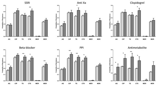 We studied the association between exposure to 19 NAMDs or classes and five antibiotic resistance phenotypes (Figure 1). On bivariate analysis, exposure to seven of the NAMDs was significantly associated with at least one resistance phenotype. NAMD and their respective associated antimicrobial resistance phenotypes were proton pump inhibitors (PPI; resistance to TMP-SMX, ciprofloxacin, ceftriaxone, and meropenem), antimetabolites (TMP-SMX, ciprofloxacin, ceftriaxone, and meropenem), beta-blockers (aminoglycosides, TMP-SMX, ciprofloxacin and ceftriaxone), clopidogrel (ceftriaxone), selective serotonin reuptake inhibitors (SSRI; ceftriaxone), typical anti-psychotics (aminoglycosides and meropenem), and anti-Xa anticoagulants (ceftriaxone and TMP-SMX). Exposure to PPI and beta-blockers was significantly associated with infection with MDRO.