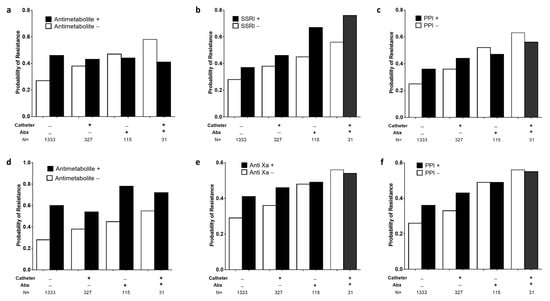 To gain further insight into the interaction between non-antimicrobials and patient characteristics, we analyzed the probability of resistance to ceftriaxone and TMP-SMX conditional on the status of the two patient covariates, urinary catheterization and recent treatment with antibiotic drugs (Figure 3). For all NAMDs that were significantly associated with ceftriaxone or TMP-SMX resistance, the probability of resistance increased for patients with negative urinary catheter and antibiotic exposure status (1333 patients, 73.8% of the cohort). The gain in resistance probability for this population ranged from 9 to 32 percentage points. Smaller increases in resistance probability were observed for patients with urinary catheters and no antibiotic exposure (327 patients, 18.1% of the cohort; 5 to 16 percentage points). The probability of resistance did not increase for patients with a history of antibiotic exposure (146 patients, 8% of the cohort), with two exceptions: SSRI and antimetabolites were associated with resistance to ceftriaxone and TMP-SMX, respectively, across all catheter and antibiotic exposure conditions (Figure 3).