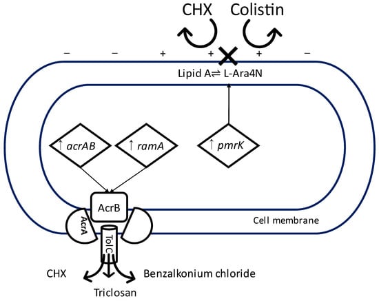 With regards to K. pneumoniae, there have been reports of cross-resistance between CHX and colistin used for the treatment of carbapenem-resistant infections [89,92]. The mechanism of action of colistin is relatively similar to CHX in that it binds to the negatively charged LPS of the cell membrane, causing leakage of intracellular content [93]. Cross-resistance between CHX and colistin is thought to be driven by the upregulation of pmrK, which is associated with a decrease of LPS anionic charge by the addition of L-Ara4N to the phosphate of lipid A [76,94,95] (Figure 1).