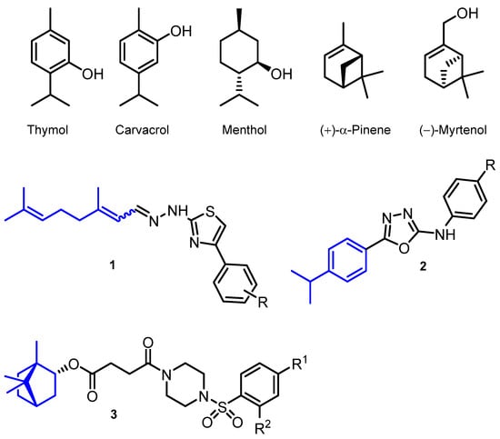 Although the use of natural compounds as a basis for the development of new drugs remains one of the most important areas of modern organic chemistry [18], the role of monoterpenes in this direction is not leading, which is largely due to the numerous synthetic difficulties that researchers working in this field face. At the same time, monoterpenes and monoterpenoids demonstrated promising fungicidal properties so far [19]. In particular, monoterpenes were reported to have antifungal activity both alone and in combination with antifungal agents [20,21,22,23]. For example, Ahmad A. et al. showed a synergistic effect against Candida spp. by combined use of fluconazole and monoterpene phenols, thymol, and carvacrol (Figure 2) [20]. In addition, studies were recently conducted on the antifungal activity of a wide range of monoterpenes of various structures (e.g., (+)-α-pinene, menthol, (−)-myrtenol, etc.), some of which showed significant activity against Candida spp. with minimal inhibition concentration (MIC) values ranging between 23–51 µg/mL [23,24].