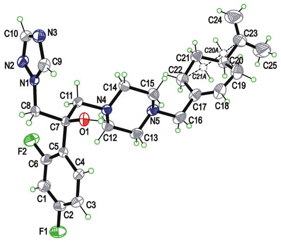 The molecular structure of 2-(2,4-Difluorophenyl)-1-(4-(((S)-4-(prop-1-en-2-yl)cyclohex-1-en-1-yl)methyl)piperazin-1-yl)-3-(1H-1,2,4-triazol-1-yl)propan-2-ol 10b with atom-labeling scheme (Displacement ellipsoids are drawn at 30% probability level. The disordered part of molecule (C20A, C21A, belonging to epimer on C20) is shown in dotted lines).