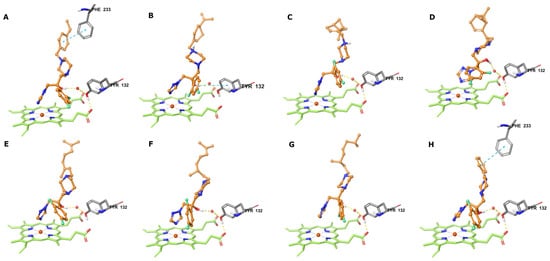 Predicted binding modes of 10a–h ((A–H), respectively) in CaCYP51 substrate binding cavity. Ligands are represented as orange sticks, amino acid residues as gray sticks, heme iron as red spheres, and H bond interactions as dashed lines.