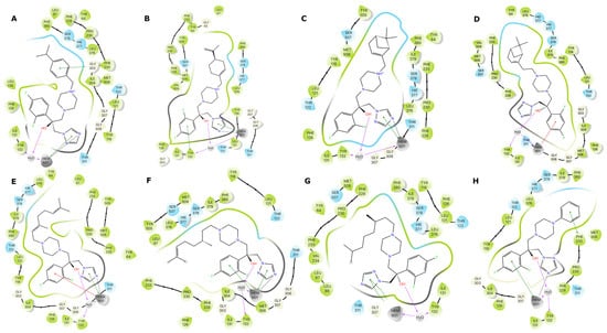 Two-dimensional interactions diagrams for the predicted binding modes of 10a–h with CaCYP51 ((A–H), respectively). All the residues within contact distance are shown, electrostatic interactions are represented as color lines/arrows, and vdW contacts are indicated as color bands around each ligand.