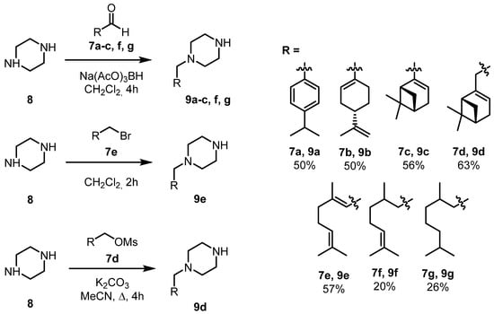 Monoterpene-piperazine building blocks 9a–g were synthesized from the corresponding monoterpene derivatives, namely aldehydes 7a–c, f, g, bromide 7e and mesylate 7d (Scheme 2). The reactions of monoterpene aldehydes 7a–c, f, g with an excess of piperazine 8 generated derivatives 9a–c, f, g with moderate yields. 3,7-Dimethyloctanal 7g was synthesized from 3,7-dimethyloctan-1-ol by the procedure described in [34]. The nucleophilic substitution reactions of piperazine 8 with geranyl bromide 7e resulted in product 9e with 57% yield. For the synthesis of 9d, (−)-nopol was converted to mesylate 7d according to [35] and then reacted with piperazine. All synthesized monoterpene-piperazines were purified by column chromatography.