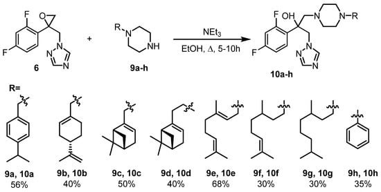 Next, two building blocks 6 and 9a–g were reacted in boiling ethanol under mild basic conditions to afford monoterpene-containing azoles 10a–g with satisfactory yields of 30–68% (Scheme 3). Similarly, phenyl-containing azole 10h was synthesized from commercially available 1-phenylpiperazine 9h. The low yield of 10f–h is associated with the incomplete conversion of the reagents. However, when trying to carry out the reaction for a longer time, undesirable side reactions were observed. The target hybrids were purified by column chromatography and isolated as an equimolar mixture of enantiomers (10a, 10e, and 10h) or diastereomers (10b–d, f, g) and were used in the biological tests as is.