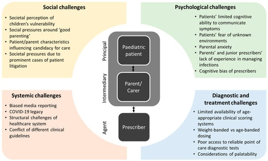 In order to understand the unique challenges to diagnosis of paediatric infections and appropriate antibiotic prescribing decisions, it is essential to consider the role of each stakeholder within the principal–agent relationship and identify the interplay of different factors that may bias judgement or impede an optimal decision process.