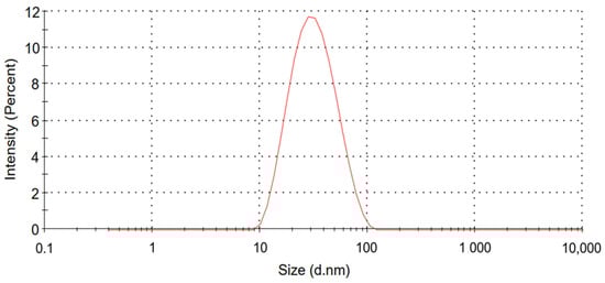 The average size of the CCM-CL was measured with a dynamic light-scattering (DLS) technique; the result indicated that each micelle was of a small uniform dimension of about 27 nm with a PdI of 0.2 (Figure 1). An HPLC also monitored the unloaded colistin. Colistin with a retention time of 5.78 and 9.20 min was quantified, and no free drug remained in the solution. An encapsulation efficiency (EE%) of 100% was therefore calculated from the HPLC using the following formula: