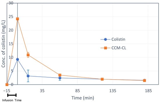 The plasma concentrations of colistin versus time in SD rats treated with intravenous injection of colistin (3 mg/kg) and CCM-CL (3 mg/kg). CCM-CL, orange circles; free colistin, blue circles.