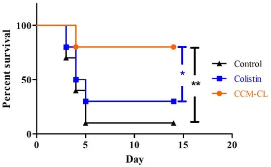 Survival curves of C57BL/6 mice infected intratracheally with Pseudomonas aeruginosa. Drugs were administered intravenously 1.5 h after infection (n = 10). Black triangles, control; blue squares, colistin; orange circles, CCM-CL. Statistical significance: * p < 0.05, ** p < 0.01.