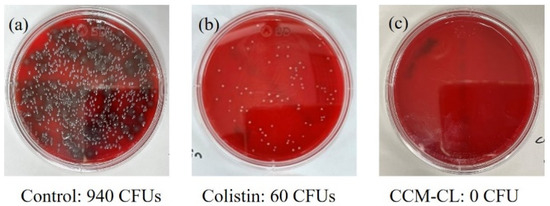 Antimicrobial effects of the colistin and CCM-CL against P. aeruginosa ATCC 27853, A. baumannii BCRC 10591, and P. aeruginosa 048,431 were determined by the minimal inhibitory concentration (MIC). P. aeruginosa ATCC 2785 and A. baumannii BCRC 10591 are standard strains; they were purchased from the American Type Culture Collection and Biosource Collection and Research Center, Taiwan, respectively. P. aeruginosa 048431 is a carbapenem-resistant blood isolate from a patient with lung adenocarcinoma and ventilator-associated pneumonia. The broth microdilution method determined the MICs for the study drugs. Briefly, serial doubling dilutions of antimicrobial agents were made in a Mueller–Hinton broth. The final bacterial suspension in the mixture was adjusted to 5 × 105 CFUs/mL, and the exact colony count was measured by plating 10-fold serially diluted specimens of 100 μL aliquots on drug-free nutrient agar (Difco Laboratories, Franklin, NJ, USA). The mixtures of bacteria and drugs were incubated at 37 °C for 24 h. The MIC is defined as the lowest antibiotic concentration preventing visible growth in broth [30].