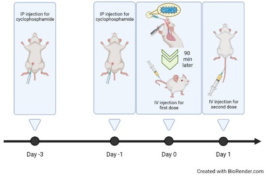 Timeline of survival curve study. Two doses of cyclophosphamide were administered, followed by a pulmonary infection test. Then, water, free colistin, and CCM-CL were administered intravenously 90 min later. The second dose was given the next day.