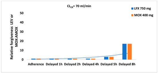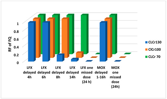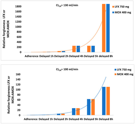 In contrast, for the PLS subgroup delays in the intake of the dose (1–8 h) resulted in different RFs for AMOX and LFX according to CLCR of virtual patients, though not for MOX in NAT (Figure 1 and Figure 2).