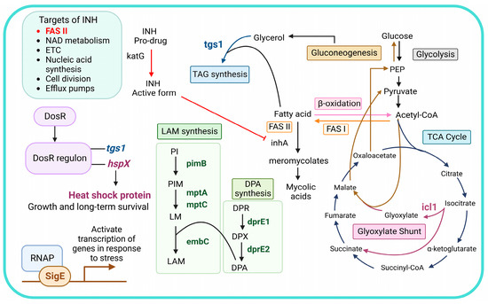 A summary of the expression of LAM-related genes and stress-response genes in response to INH under the MS. The red arrows represent down-regulation and the green arrows represent up-regulation when compared between the MSI and MS. Abbreviations: DosR, dormancy survival regulator; DosR regulon, dormancy survival regulator regulon; RNAP, RNA polymerase; INH, isoniazid; TAG, triacylglycerol; PI, phosphatidylinositol; PIM, phosphatidylinositol mannoside; LM, lipomannan; LAM, lipoarabinomannan; DPR, decaprenylphosphoryl-D-ribose; DPA, decaprenylphosphoryl-D-arabinose; DPX, decaprenylphosphoryl-2-ketoribose; FASI, fatty acid synthase I; FAS II, fatty acid synthase II; PEP, phosphoenolpyruvate.