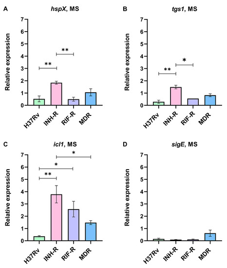 The relative expression of stress-response genes in four strains of Mtb in a multi-stress system (MS) compared to a nutrient-rich model (NR): (A) hspX, (B) tgs1, (C) icl1, and (D) sigE. * significant at ρ < 0.05; ** significant at ρ < 0.01 were determined by one-way analysis of variance with Tukey’s multiple comparison.
