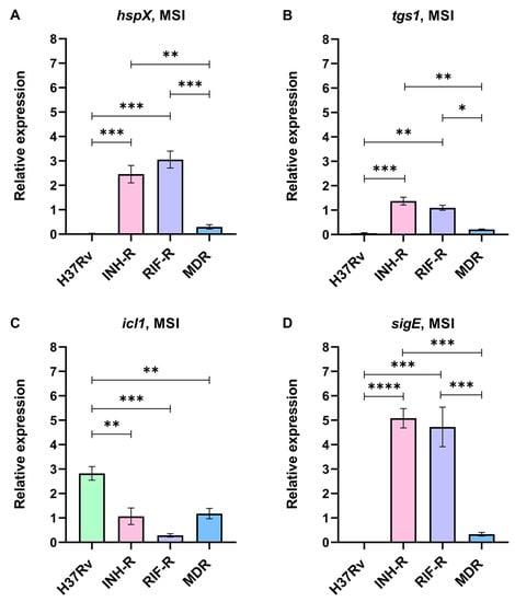 The relative expression of stress-response genes in four strains of Mtb in a multi-stress system with INH treatment (MSI) compared to a multi-stress system (MS) without INH treatment: (A) hspX, (B) tgs1, (C) icl1, and (D) sigE. * significant at ρ < 0.05; ** significant at ρ < 0.01; *** significant at ρ < 0.001; **** significant at ρ < 0.0001 were determined by one-way analysis of variance with Tukey’s multiple comparison.