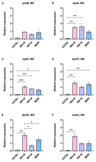 The relative expression of LAM-related genes in four strains of Mtb in a multi-stress system (MS) compared to a nutrient-rich model (NR): (A) pimB, (B) mptA, (C) mptC, (D) dprE1, (E) dprE2, and (F) embC. * significant at ρ < 0.05; ** significant at ρ < 0.01; *** significant at ρ < 0.001 were determined by one-way analysis of variance with Tukey’s multiple comparison.