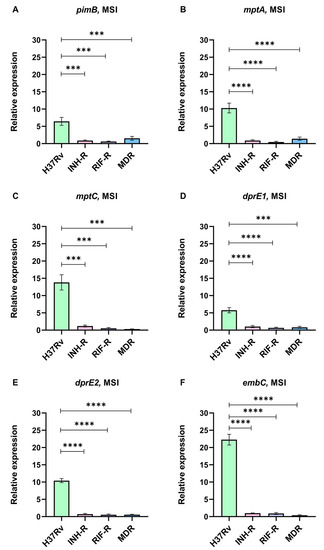 The relative expression of LAM-related genes in four strains of Mtb in a multi-stress system with INH treatment (MSI) compared to a multi-stress system (MS) without INH treatment: (A) pimB, (B) mptA, (C) mptC, (D) dprE1, (E) dprE2, and (F) embC. *** significant at ρ < 0.001; **** significant at ρ < 0.0001 were determined by one-way analysis of variance with Tukey’s multiple comparison.