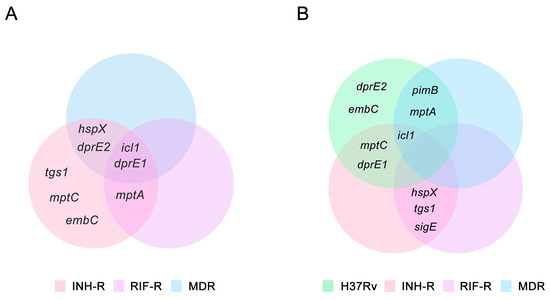 The Venn diagrams demonstrate stress-response genes and LAM-related genes of the H37Rv, INH-R, RIF-R, and MDR strains, which are up-regulated under the MS and MSI conditions: (A) a multi-stress system (MS) compared to a nutrient-rich model (NR) and (B) a multi-stress system with INH treatment (MSI) compared to a multi-stress system (MS) without INH treatment.