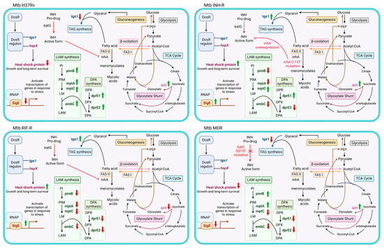Tuberculosis (TB) is caused by Mycobacterium tuberculosis (Mtb). Worldwide, an estimated 10.6 million people were infected with TB and 1.6 million people died from TB in 2021 [1]. Treating Mtb infection is challenging due to the development of drug tolerance and drug resistance. During an infection as they are contained inside macrophages and within granulomas, mycobacteria encounter environmental stresses, such as nutrient limitation, hypoxia, acidic pH, nitric oxide, oxidative stress, and other host defense responses [2]. However, Mtb is a specialized pathogen that can adapt and persist within the host environment via stress response regulation [3,4]. The stress response of Mtb within the host environment requires the coordination of several events initiated by gene regulation and expression, resulting in physiological changes [5,6,7]. Environmental stress influences mycobacterial metabolic activity and induces a non-replicating state, allowing Mtb to persist for extended periods of time [8,9,10,11]. Moreover, mycobacterial adaptation and non-replicating state are associated with antibiotic tolerance, as presented in stress models and TB patients [8,9,10,12,13,14].