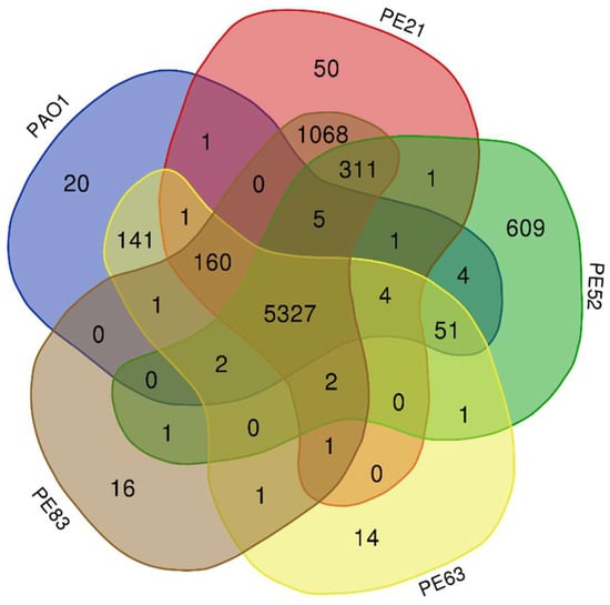 Genomic comparison of P. aeruginosa strains. The pan-genome analysis by Roary predicted the number of genes. The figure was created using Calculate and Draw Custom Venn Diagrams. The Venn diagram shows the number of unique and shared genes among the genomes of five strains: PAO1, PE21, PE52, PE52, PE63, and PE83 from the Mexican hospital.