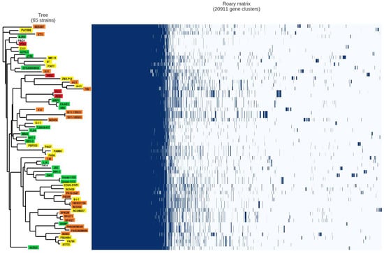 - Page, A.J.; Cummins, C.A.; Hunt, M.; Wong, V.K.; Reuter, S.; Holden, M.T.G.; Fookes, M.; Falush, D.; Keane, J.A.; Parkhill, J. Roary: Rapid large-scale prokaryote pan genome analysis. Bioinformatics 2015, 31, 3691–3693. [Google Scholar] [CrossRef] [PubMed]