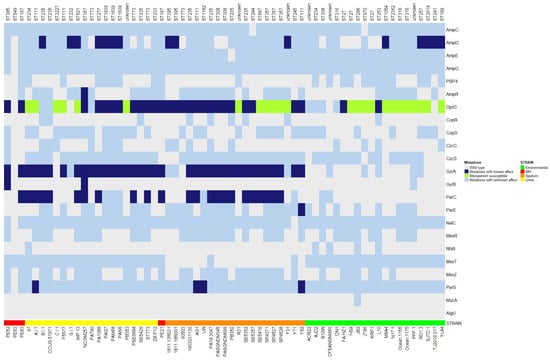 Mutational resistance of the 65 urinary, sputum, and environmental genomes. Graphical representation of mutations associated with antibiotic resistance (navy color), mutations with an unknown effect on antibiotic resistance (blue light), and mutations in oprD associated with susceptibility to meropenem (green) and wild-type genes (gray). P. aeruginosa PAO1 and PA14 were used as reference genomes. The heatmap was constructed with the Bioconductor package in Rstudio. MH means Mexican Hospital.