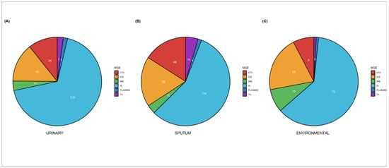 Mobile Genetic Elements (MGEs) are distributed in the 65 genomes of urinary (A), sputum (B), and environmental (C) strains. Each pie graphic represents the distribution of mobile genetic elements in each group of strains, and the numbers within the pie graphic represent the number of MGEs found. Tn (transposons), CTn (composite transposons), IS (insertion sequence), IMEs (integrative mobilizable elements), ICEs (integrative conjugative elements), and plasmids.