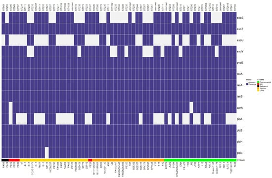 We analyzed 116 virulence genes associated with alginate biosynthesis and regulation, rhamnolipid biosynthesis, iron uptake, quorum sensing, proteases, and toxins using the Virulence Factor Database (VFDB). However, we included only thirteen virulence factors associated with urinary tract and lung infections in the heatmap. In addition, we used the virulence genes of the PAO1 strain as a reference, and the exoU gene of the PA14 strain was taken as a reference.