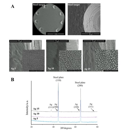 SEM images (A) of the bare plates as well as silver coatings obtaining using the CVD process with different amounts of the precursor (5, 10, and 15 mg). Registered XRD patterns for the studied plates (B) confirmed the deposition of the silver nanoparticles on the surface of the steel substrates. Ag 5, 10, 15—silver coating obtained using 5, 10, and 15 mg of the precursor; a.u.—arbitrary units.