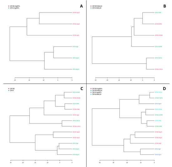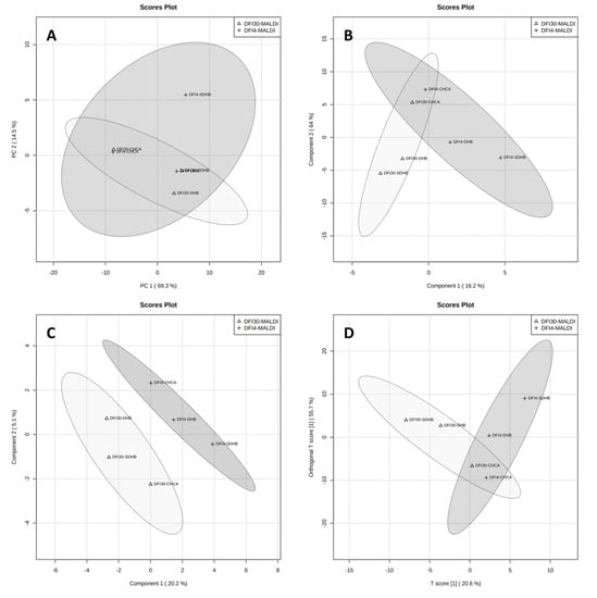 Figure 2 shows the results of statistical analysis of data from measurements of lipid extracts of strains DFI4 and DFI30 by the MALDI-MS technique using three matrices: α-cyano-4-hydroxycinnamic acid (CHCA), 2,5-dihydroxybenzoic acid (DHB), and super-DHB. From analyzing charts, it can be concluded that only the sPLS-DA score plot (Figure 2C) presents completely separated groups. The other three used statistical methods, PCA (Figure 2A), PLS-DA (Figure 2B), and OPLS-DA (Figure 2D), did not allow for complete separation of analyzed strains. In Figure 2B,D, it can be seen that the samples that most affect the separation of groups are the extracts measured using the CHCA matrix. Therefore, it can be concluded that the matrix used has a decisive effect on the separation of groups in the MALDI method. This is confirmed by the dendrogram made for the same data (Figure 3B).