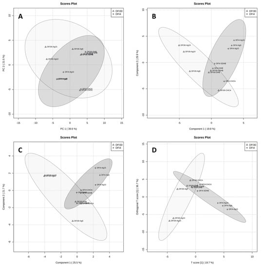 Graphical representation of statistical analysis of MS data from MALDI and SALDI/NALDI experiment with two groups: PCA component 1 vs. 2 (A), PLS-DA component 1 vs. 2 (B), sPLS-DA component 1 vs. 2 (C), and OPLS-DA (D). Dark-grey area represents data for DFI-4 strain while light-grey represents DFI-30 strain.