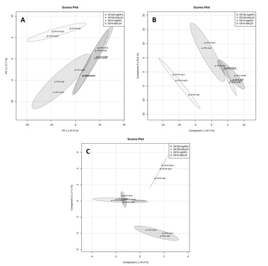 The SALDI method based on plates with silver nanostructures applied by the CVD technique shows a complete separation of the two tested strains by all the statistical methods used (Figure 6). In addition, the generated dendrogram first shows the grouping of samples by strain and then by the data recorded on the different plates (Figure 3A). Additionally, when all results are analyzed across two or four groups, data from SALDI-MS measures show more variation than data from MALDI (Figure 4 and Figure 5). This implies a smaller effect of the SALDI plates used on the spectral data than is the case with the MALDI method. This can be explained by the presence of less chemical background in the form of additional signals from the matrix used (Table 4).