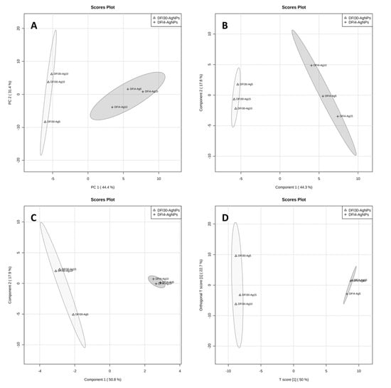 Graphical representation of statistical analysis of MS data from SALDI/NALDI experiment: PCA component 1 vs. 2 (A), PLS-DA component 1 vs. 2 (B), sPLS-DA component 1 vs. 2 (C), and OPLS-DA (D). Dark-grey area represents data for DFI-4 strain while light-grey represents DFI-30 strain.