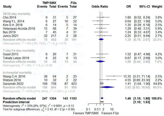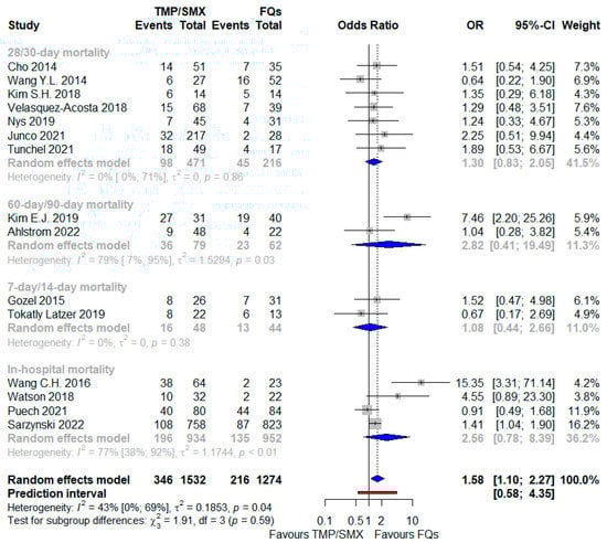 When also including studies in which either TMP/SMX or FQs could be used in the context of combination therapy, the worse outcome associated with TMP/SMX-based regimens was further corroborated, as shown in Figure 4: OR 1.58 (95% CI 1.10–2.27), I2 = 43%, including more patients (2806, with an overall higher death rate equal to 20%); nevertheless, the PI ranged from 0.58 to 4.35, including an opposite effect as well. No interaction was demonstrated between the subtotal estimates for the four identified subgroups based on mortality timing. In the subgroup of the BSI, TMP/SMX-based regimens were linked with a more than two-fold higher risk of a fatal outcome compared with the FQ-based regimens (Table 2).