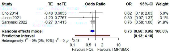 A sensitivity analysis through the leave-one-out method was performed, as far as the primary outcome was concerned, only for the comparison between TMP/SMX and FQs, the one based on more studies, and the related results are shown in Figures S3 and S4 (both available in the Supplementary Data). In the first case (only monotherapy studies), omitting the work by Sarzynski and colleagues [44], the largest as the sample size, did not shift the direction of the effect but made the results not significant: OR 1.65 (95% CI 0.98–2.78), with nearly overlapping heterogeneity (I2 = 39%). Instead, omitting the study by Wang CH and collaborators [28], the one describing the worst outcome from TMP/SMX, shrank the heterogeneity to zero without impacting the results. In the second case, neither the effect size nor the heterogeneity were notably affected by omitting a particular study.