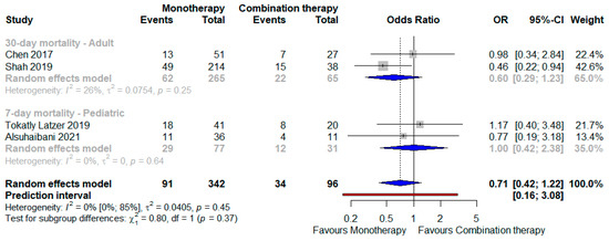 Eventually, when the monotherapy strategy was compared with a combination approach, whichever were the anti-SM agents, the former was associated with a better outcome compared to the latter (Figure 5): OR 0.71 (95% CI 0.56–0.95) against a backdrop of no heterogeneity (I2 = 0); the PI also, in this case, contained the opposite effect (0.16–3.08), but no subgroup difference was highlighted among the adult and pediatric patients.