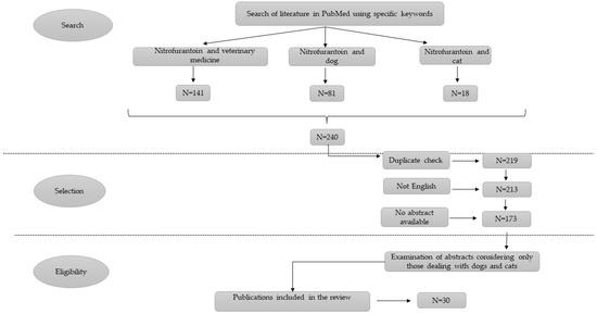 A systematic review has been performed considering only the archive of PubMed. The authors decided to enter the keywords nitrofurantoin, veterinary medicine, dog, and cat connected by the Boolean operator “and”. No restriction on the date of publication was applied. The resulting papers have been checked to find duplicates, and further selected if they were written in English (other languages were considered as an exclusion criterion) and the abstract was available. The last part of the selection process was performed by reading the abstracts: only those dealing with dogs and cats were considered. The entire workflow with the different passages of the selection process is presented in Figure 1.