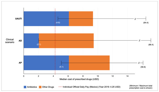 The median total costs per prescription were similar for the three scenarios. The highest cost was for AP (median: 11.6 USD), followed by AD (median: 9.5 USD) and UAUTI (median: 9.4 USD (Figure 1).