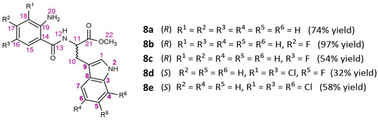 The linear dipeptides 8a–8e were synthesized through a coupling reaction between the appropriate anthranilic acid (5) and tryptophan methyl ester derivatives (7), in the presence of the coupling agent 2-(1H-benzotriazole-1-yl)-1,1,3,3-tetramethylaminium tetrafluoroborate (TBTU) and triethylamine (Et3N) at room temperature (rt) for 5 h (Scheme 1) [29]. It was possible to effectively obtain and characterize through nuclear magnetic resonance (NMR) methods linear dipeptide 8a, which is a precursor for the natural products glyantrypine (1) and fumiquinazoline F (2), as well as the four halogenated dipeptides 8b–8e (Figure 4).